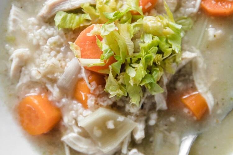 For veggies, for this healthy chicken and pearl barley soup I used lots or carrots and celery. You can also use broccoli if you like. And save the celery leaves to serve on top. They look pretty and add a nice fresh touch.