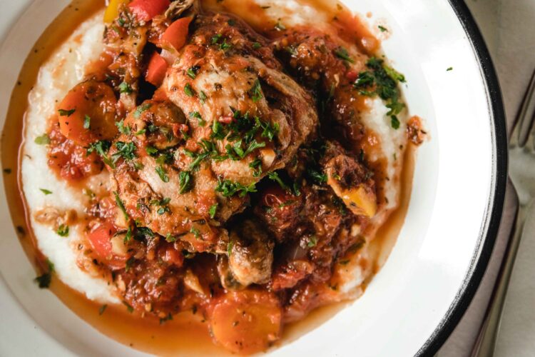 Chicken cacciatore with chicken thighs, vegetables and polenta