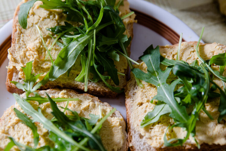 - To serve, spread a thin layer over a piece of bread. Top with some arugula leaves and a few drops of olive oil and apple cider vinegar.