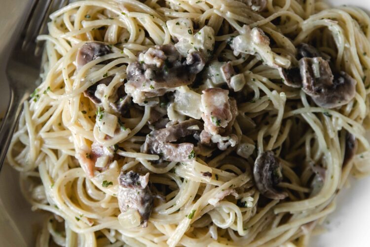 Just make sure to cut mushrooms for this creamy pasta with mushrooms and bacon thinly. That way they blend better with the rest of the ingredients.