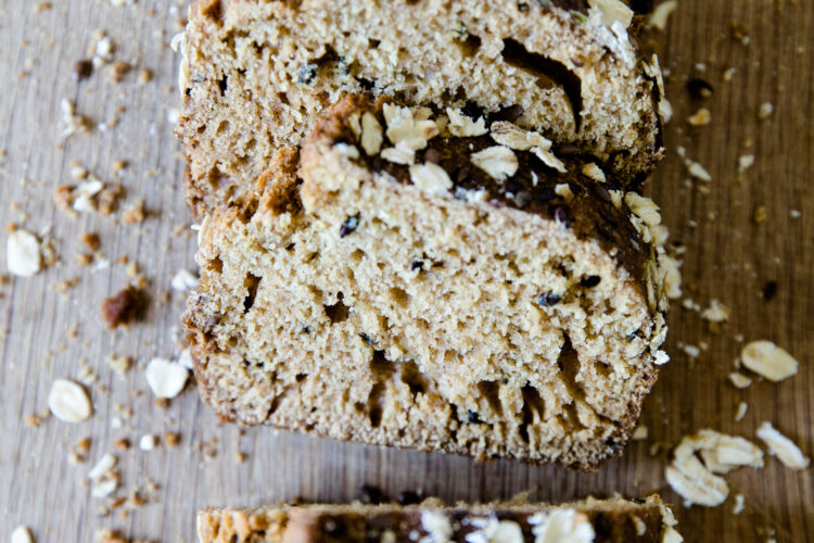 For toppings for this easy bread recipe without eggs, I like to use simple oats and flax seeds. This is optional step, but it makes for a pretty presentation. And I always like that!