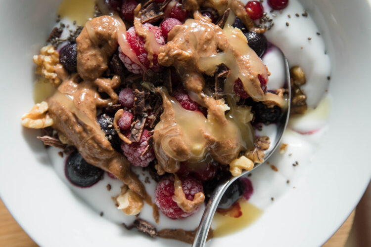 - In a medium size bowl add yogurt then top it with berries, chia, walnuts, chocolate, almond butter and honey.