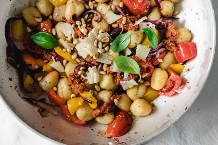 I am starting a new series on my YouTube channel and here on the blog – easy one pan meals. And first up are these gnocchi with sun dried tomato pesto!