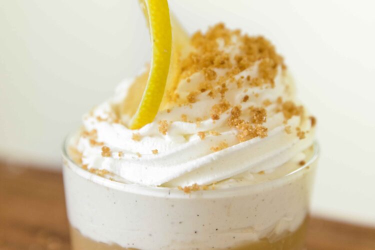 - To serve, cover bottom of a small glass with half of the biscuit mixture. Layer over thin but visible layer of lemon curd. Top with the cheese filling. Then decorate with whipping cream or slag, sprinkle of ground biscuits and a slice of lemon.