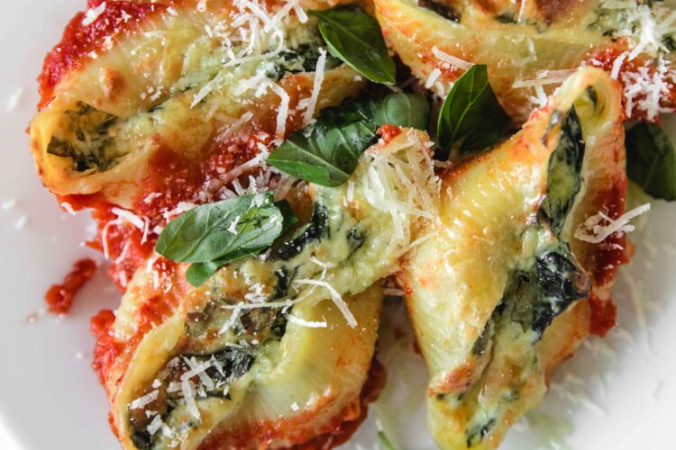 You can serve these stuffed pasta shells with spinach as an appetizer or a main course. With lots of parmesan, fresh basil leaves and olive oil for pretty presentation, of course!