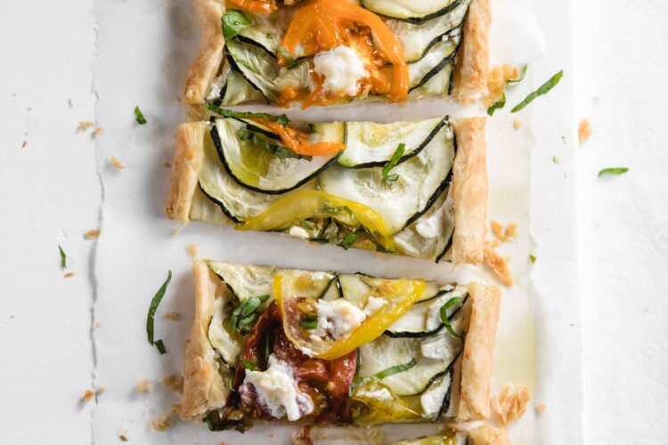 Italian puff pastry is combinations of creamy ricotta, pretty neutral in flavor zucchini, those colorful and beautiful heirloom tomatoes and basil, of course.