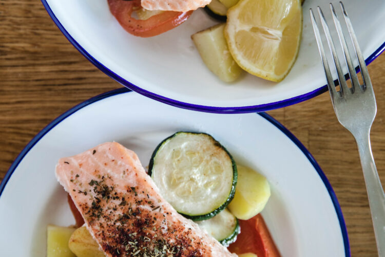 - Bake in the preheated oven at 200°C for around 25 minutes or until salmon and vegetables are cooked through.
