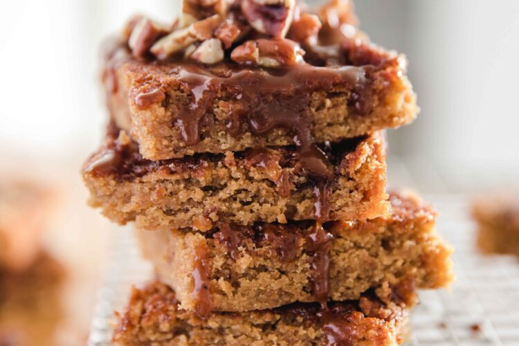 Before baking these salted caramel pecan blondie recipe, you can scatter chopped pecans on top of the sauce. I prefer to serve them on top of each slice with more caramel sauce.