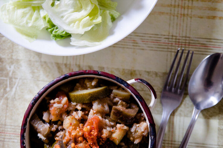 This vegetarian aubergine and rice stew goes well with any salad. During Spring and Summer, green leaf salad, tomatoes and cucumber are my choice.
