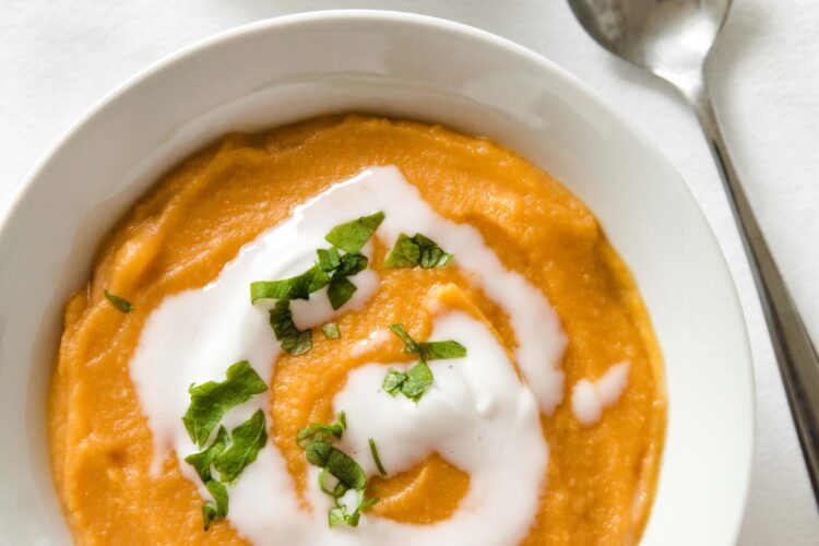 You can get creative with toppings for this vegetarian pumpkin soup fresh pumpkin. This time I used simple coconut yogurt and chopped parsley but roasted pumpkin seeds, chili flakes or chili oil will work well too!
