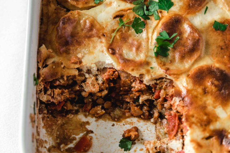 This is also vegetarian moussaka lentils. Lentils act as a meat replacement and they kind of look like minced meat. They are pretty neutral and take on any flavour/spices you add to the dish. Lentils are also cheaper than meat which is a plus.